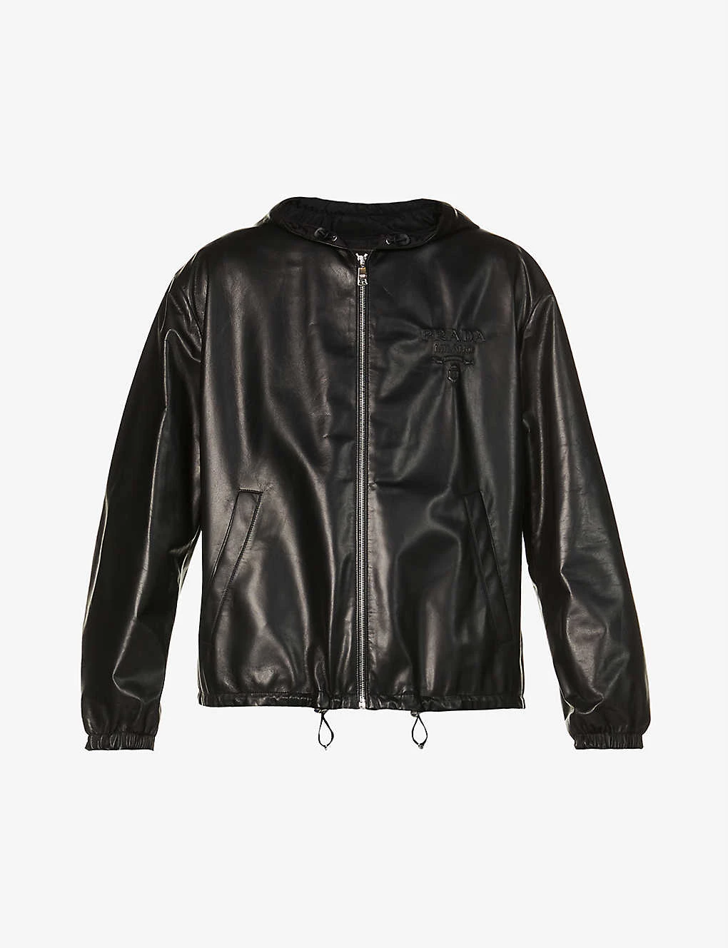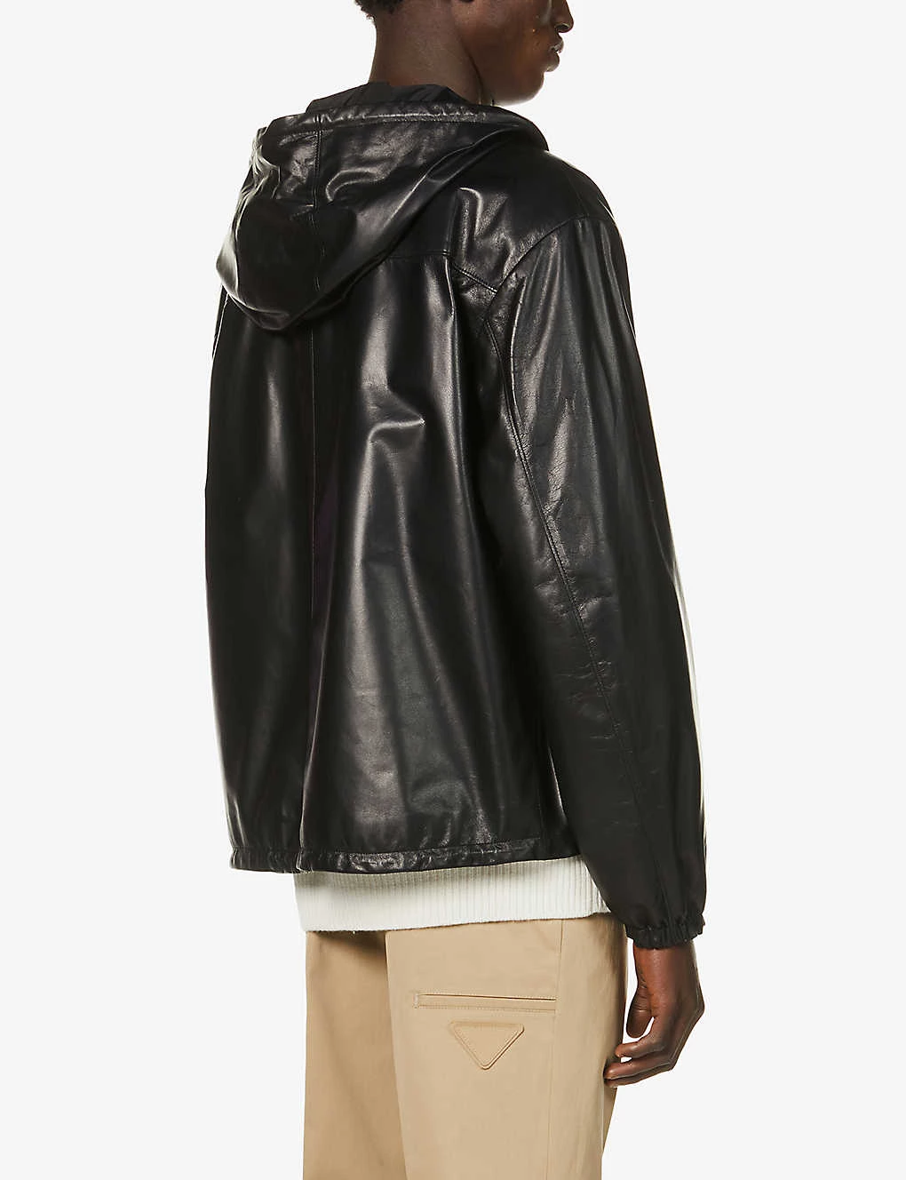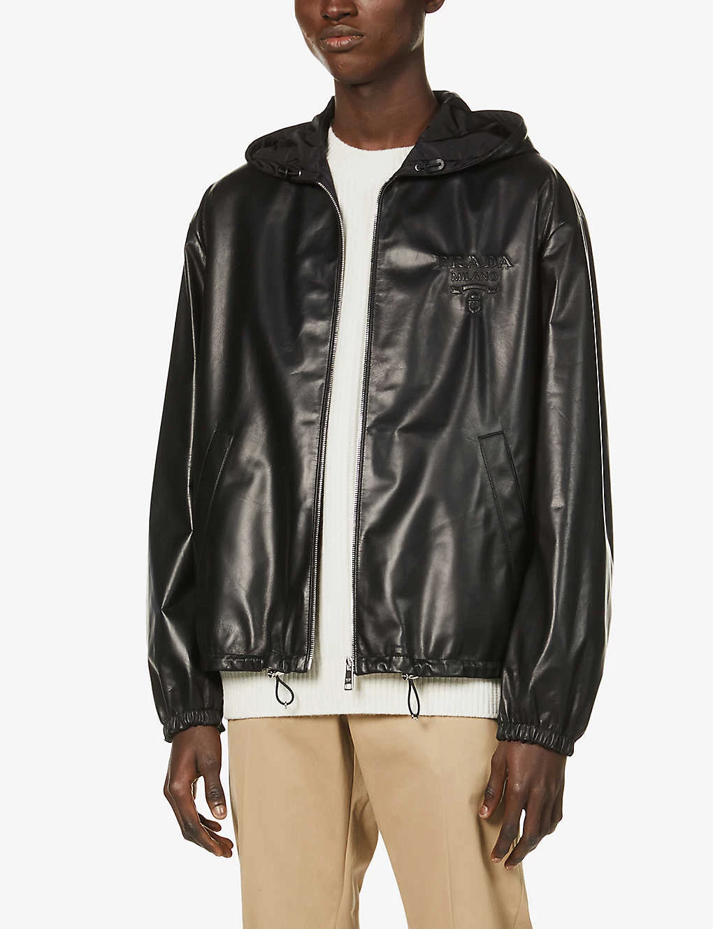 PRADA Brand-debossed Regular-fit Leather Hooded Bomber Jacket For Mens Nero