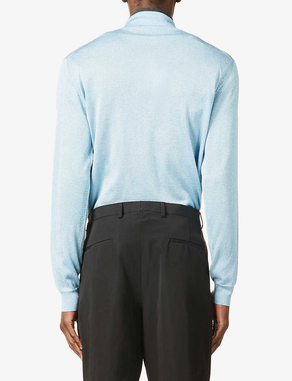- Spread collar, long sleeves, brand embroidery at chest, all-over glitter texture, ribbed elasticated hem