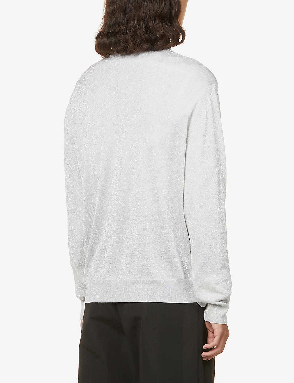 - V-neck, dropped shoulders, long sleeves, all-over metallic fibres, fine knit, brand embroidery at chest, relaxed fit, ribbed trims