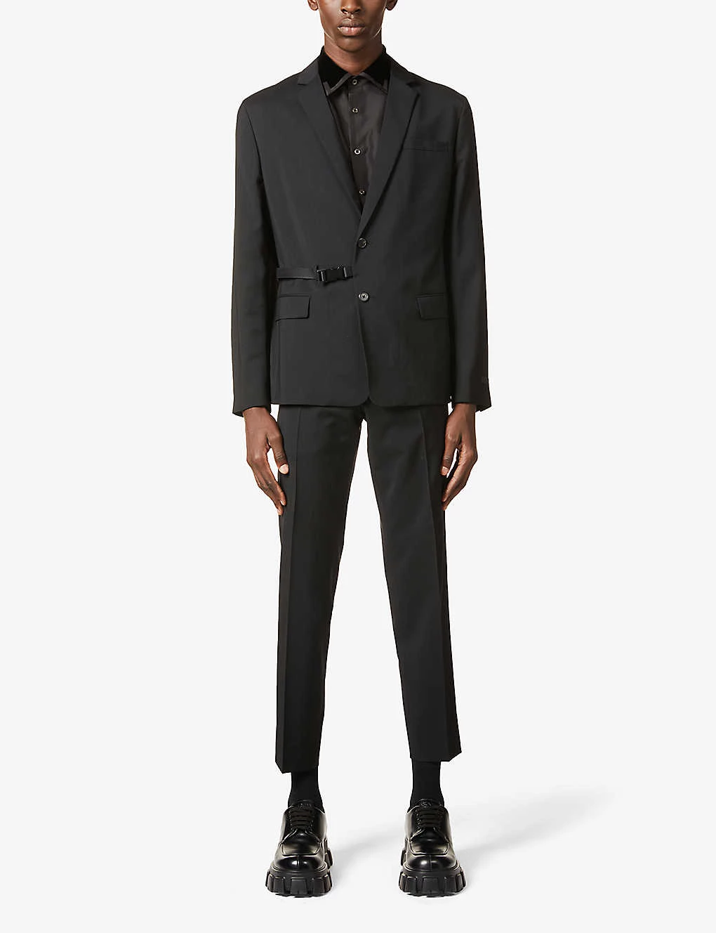 - Snap tab velvet collar, long sleeves, buttoned cuffs, brand triangle shape tag at chest, all-over silk texture