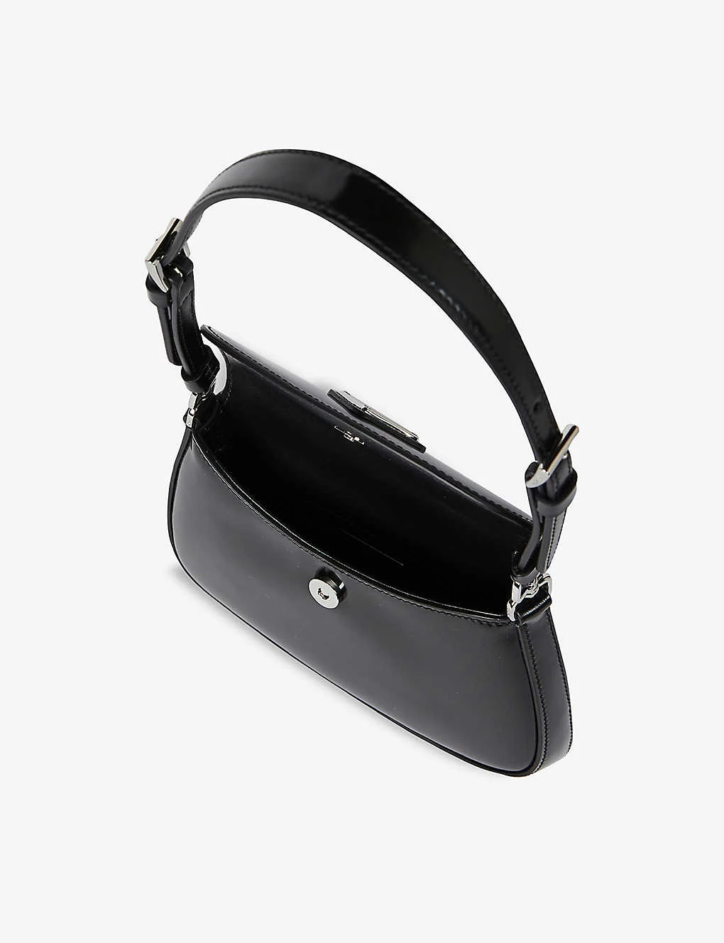 - Adjustable buckle shoulder strap, branded silver-toned hardware, enamelled brand plaque at front, flap closure at front, one main compartment, metallic brand plaque at interior, fully lined