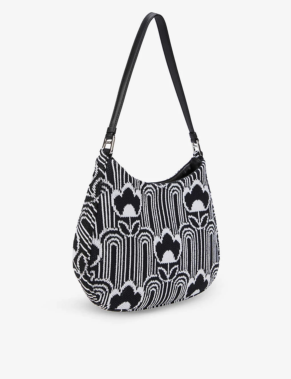 - Single shoulder strap, brand patch at front, all-over abstract jacquard pattern, one main compartment, one internal slip pocket, brand patch at interior pocket, fully lined