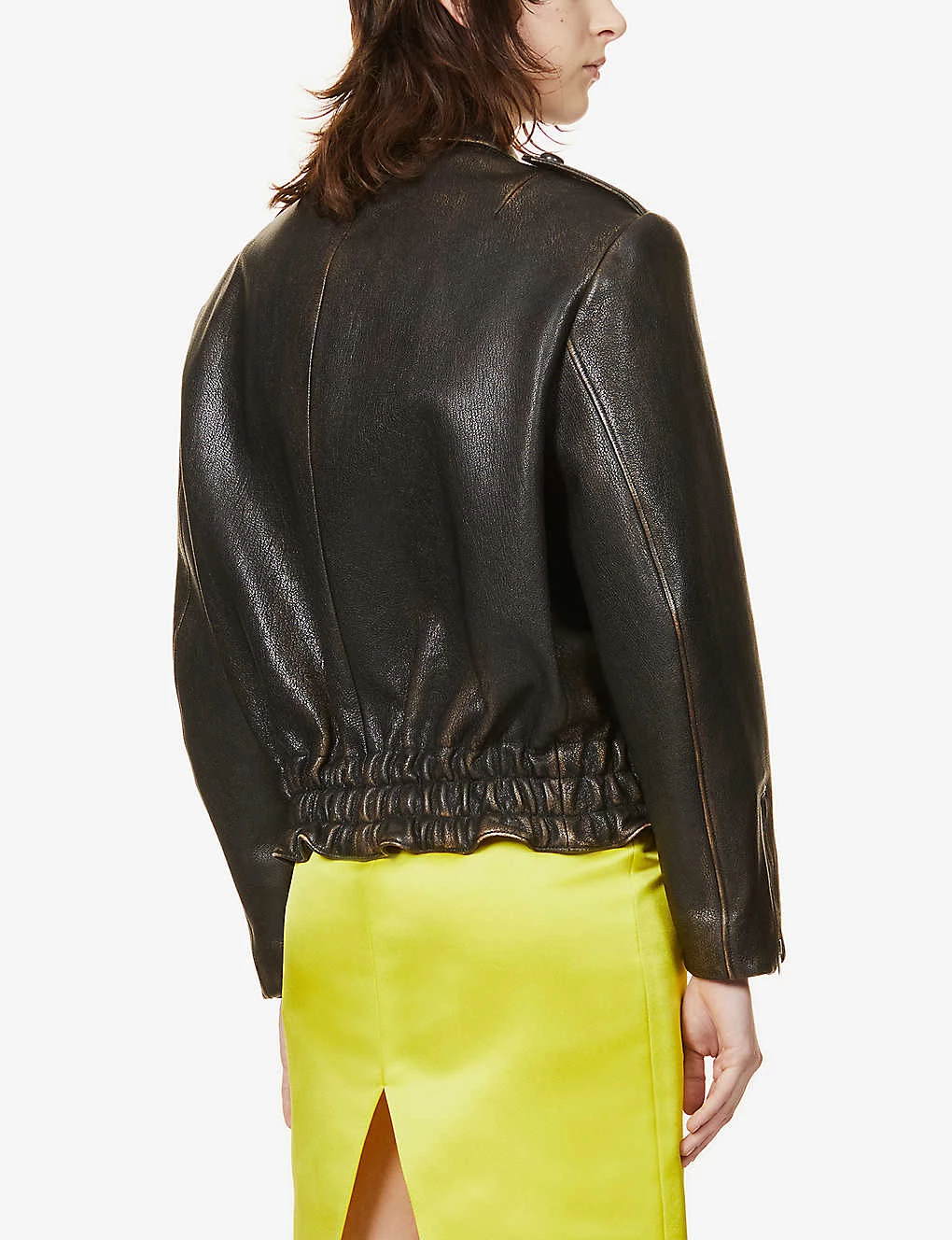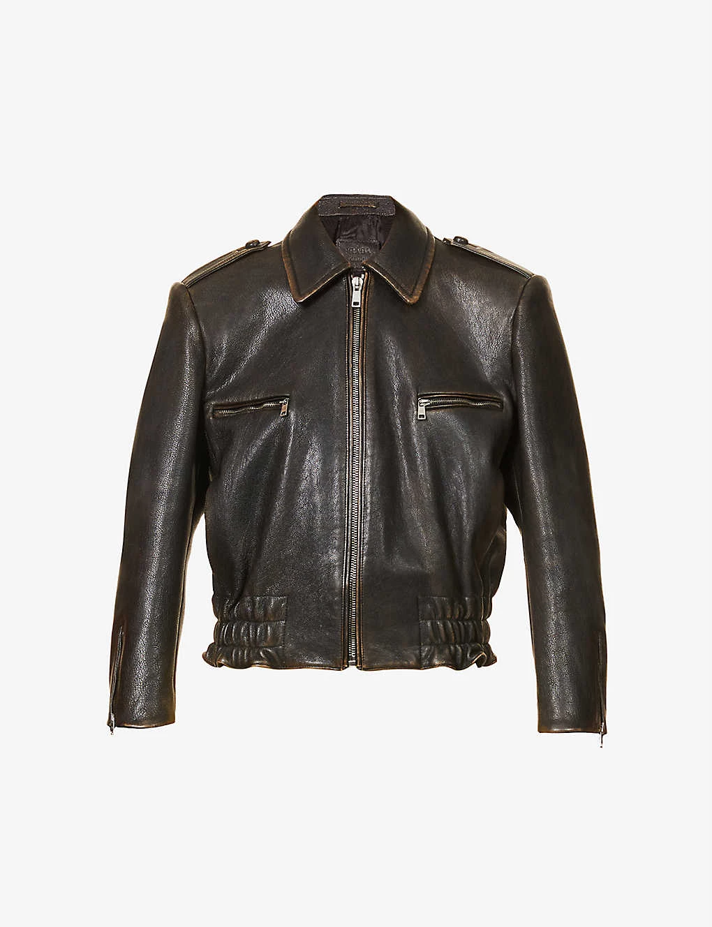 - Spread collar, padded shoulders, shoulder epaulets, long sleeves, zipped cuffs, faded pattern, zipped pockets at chest, slip pockets at front, elasticated hem