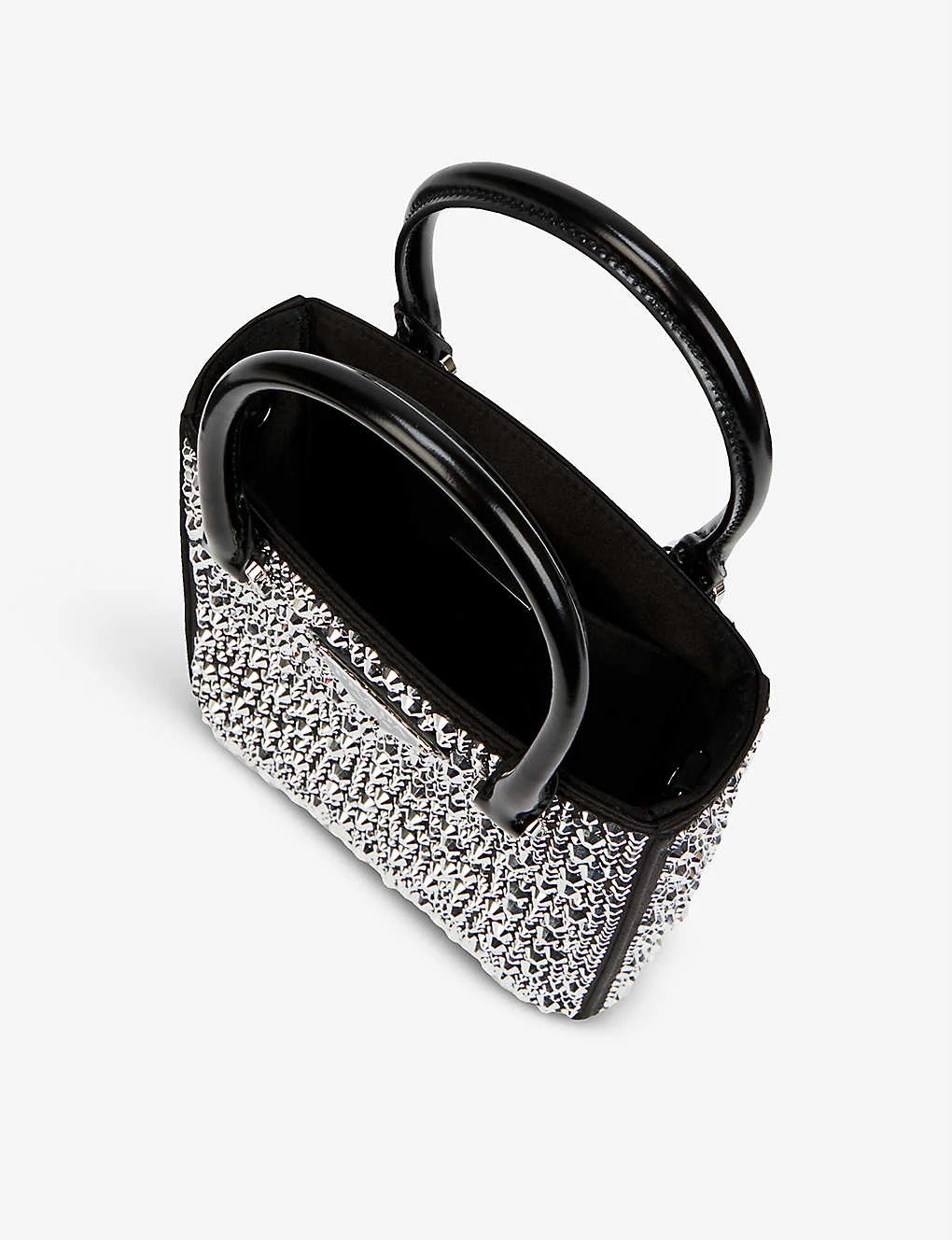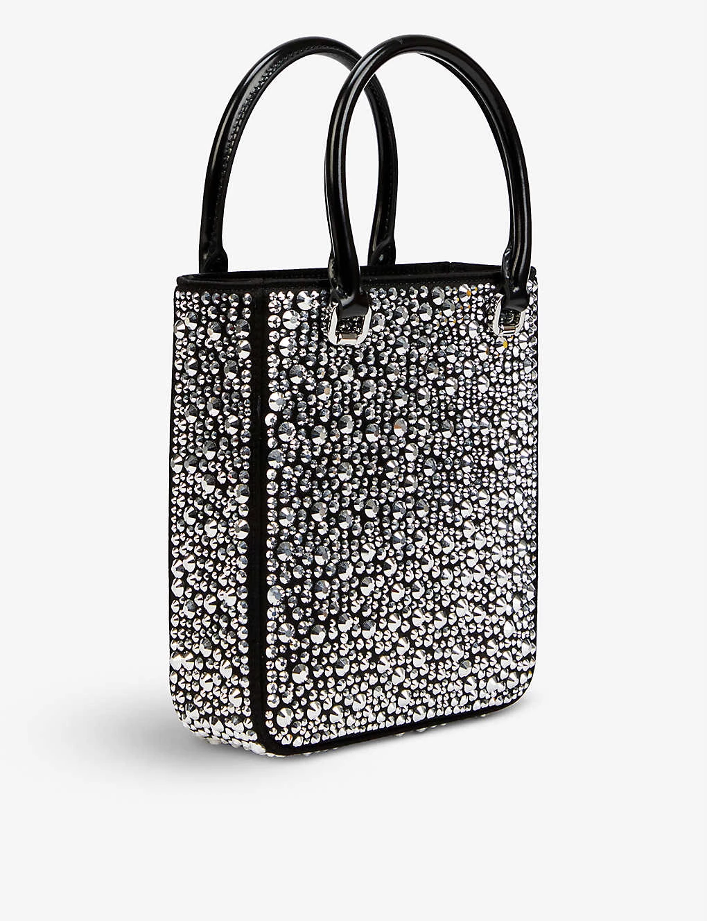 - Double-top handles, enamelled brand plaque at front, all-over rhinestone-embellishment, detachable shoulder strap, branded silver-toned hardware, one main compartment, internal slip pocket, branded metallic plaque at interior, fully lined