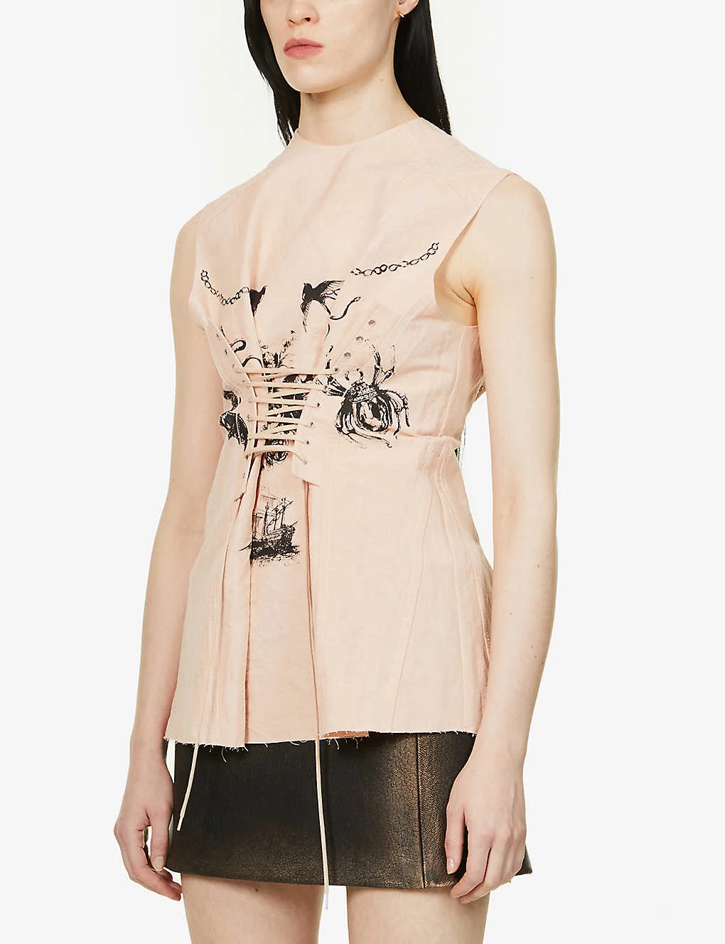 - Relaxed fit, round neck, sleeveless, graphic print at front, corset lace-up panel at front and back, branded graphic print at back, distressed hem