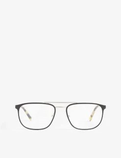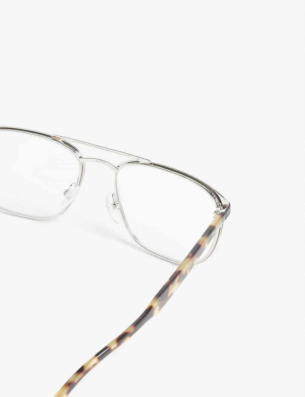 - Square frames, clear lenses, tortoiseshell effect arms, round tips