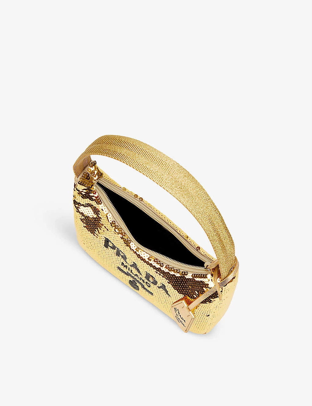 - Shoulder strap, branded keyring with tag at side, woven branding at front, all-over sequin embellishment, one main compartment, enamelled brand plaque at interior, fully lined