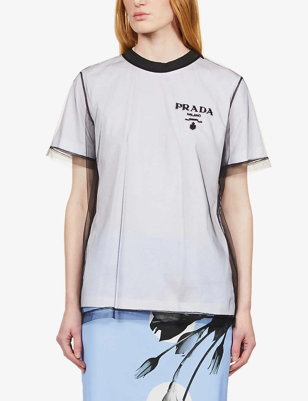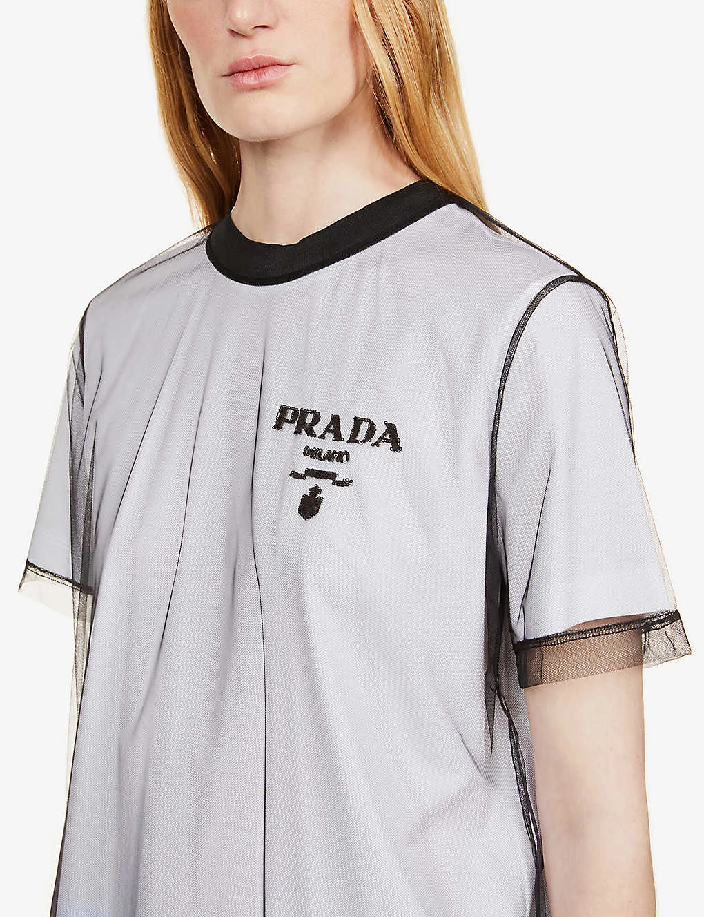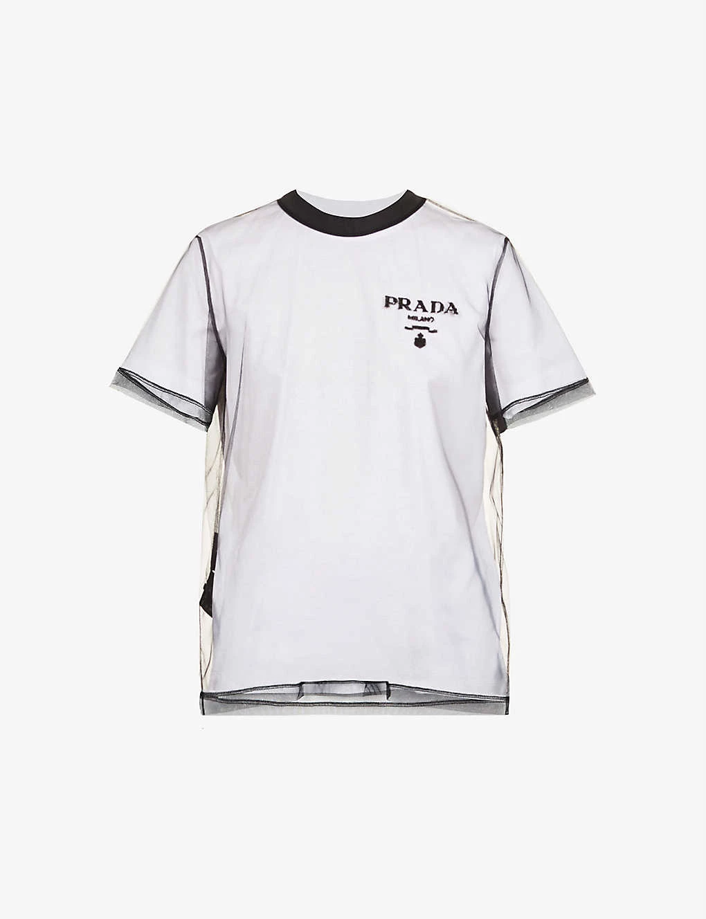 PRADA Sequinned Logo Mesh And Cotton-jersey T-shirt For Womens Bianco+nero