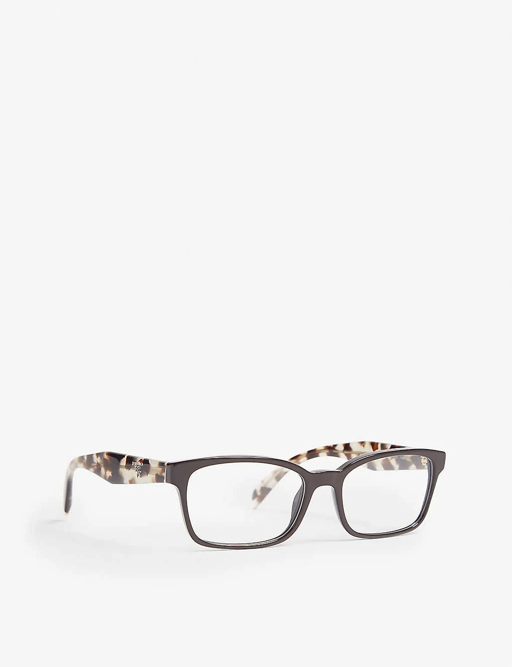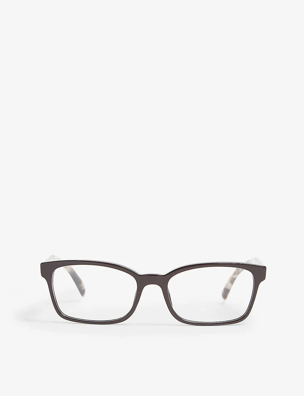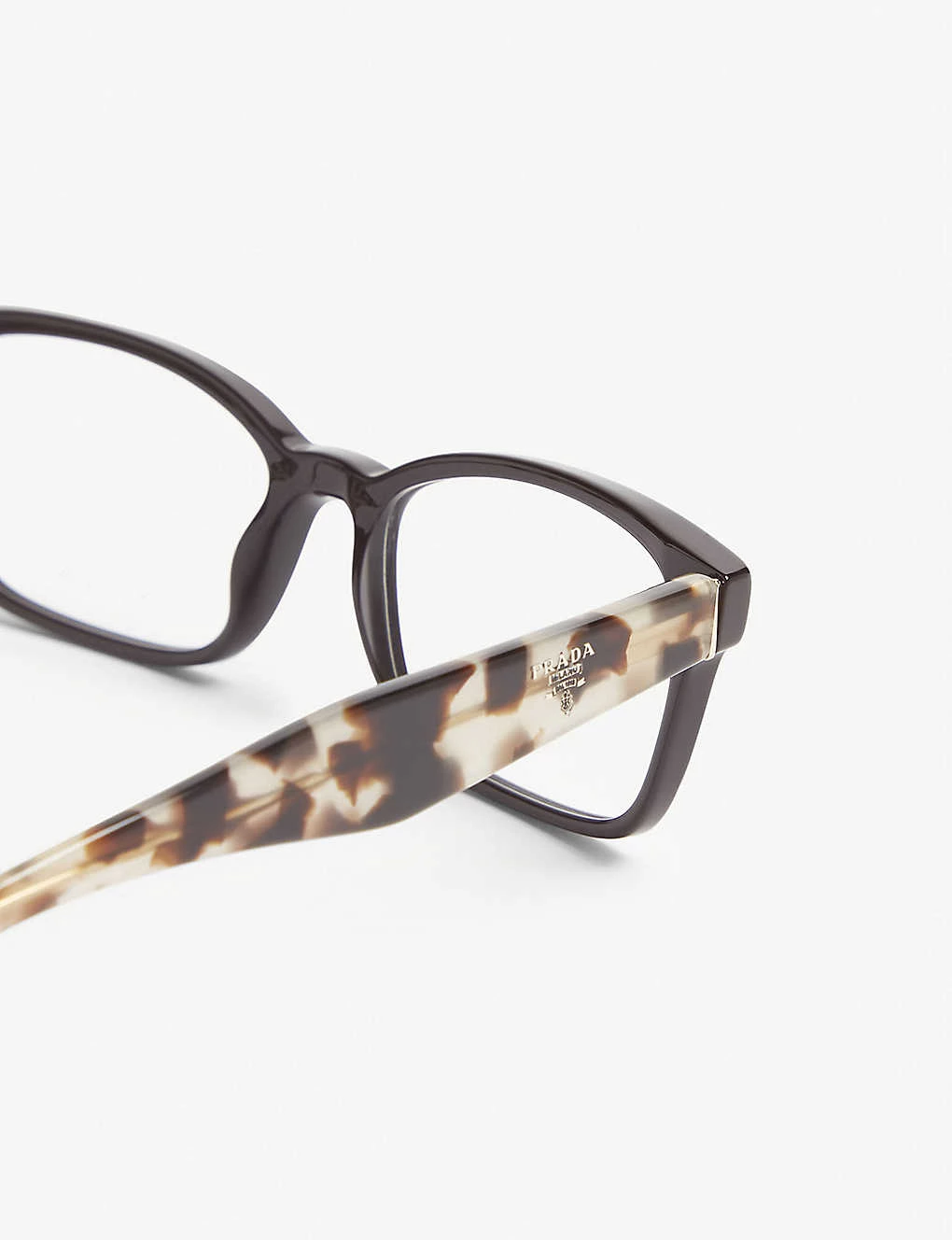 - Rectangle-frame, tortoiseshell arms, branded lettering